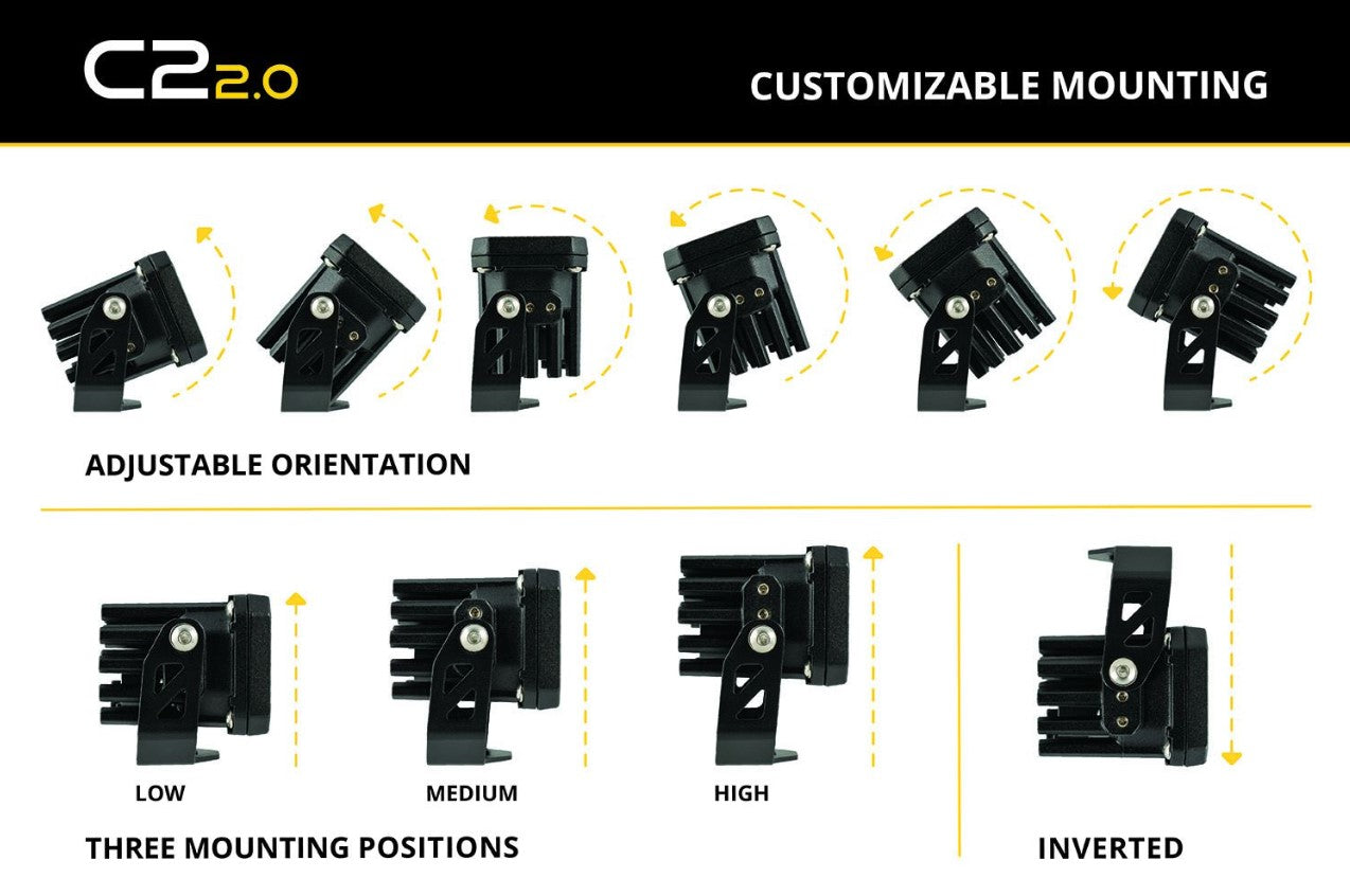 Customizable Mounting. The C2 2.0 LED pod features three mounting points to adjust the pod’s height. The revised mounting bracket also allows for even more adjustment to the angle of the pod for a more dialed-in setup.