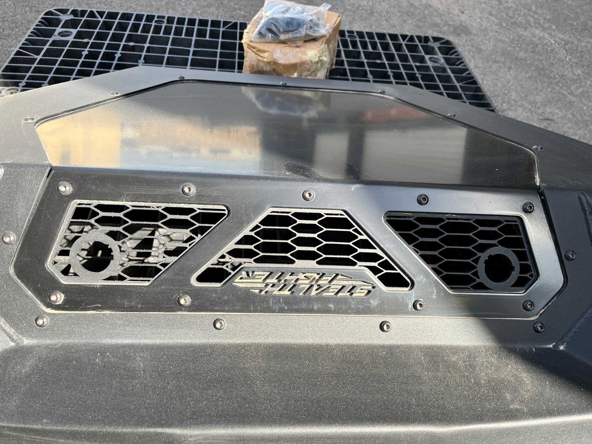 The Stealth Fighter has been our most popular line of bumpers, and for good reason. It is one of our tightest fitting bumpers and is synonymous with the Raptor in the off-road community. This was designed to closely follow the Raptor's body lines, and provides better ground clearance and approach angle than the OEM bumper. The front of the bumper sticks out only 1/2-inch further than the OEM bumper in order to fit LED lights within. The center light mount can accommodate either a 40-inch radius LED light bar, or up to 10 LED cube lights. There are 2 side mounts for Rigid 10-inch SR LED light bars on either side of the bumper for additional lighting. These mounts sit behind satin black aluminum panels with vented slots, so if you decide to not mount any side lights there are no empty holes in the bumper.
